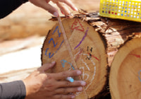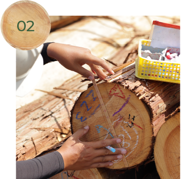 原木を種類、長さ、サイズ毎に仕分けます。主要サイズは、椪積みを行い、一本ずつ手作業で寸検し、データ入力し、種類、本数、サイズ毎に管理を徹底。売主、買主ともに安心してご利用できるようにしています。