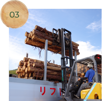山主の皆様や素材業者様から、市場へ出す原木を受け入れます。間伐・全伐作業により、原木を切り出します。切り出された原木数十本をトラックに乗せ市場まで運び、原木を受け入れます。