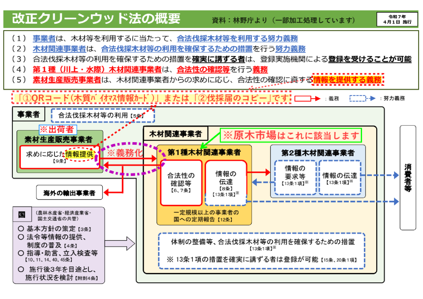 さて、令和7年4月1日より改正クリーンウッド法が施行されます。この法律は、合法伐採木材等の流通および利用に関する法律で、平成29年に施工されていましたが、令和7年4月1日より厳しく義務付けられる事となりました。当市場も義務化への対応といたしまして、出荷者の皆さまから出荷される際に、下記の書類のどちらかをご提出いただく事で、義務への対応ができますので、今後お忘れないようにお願いいたします。